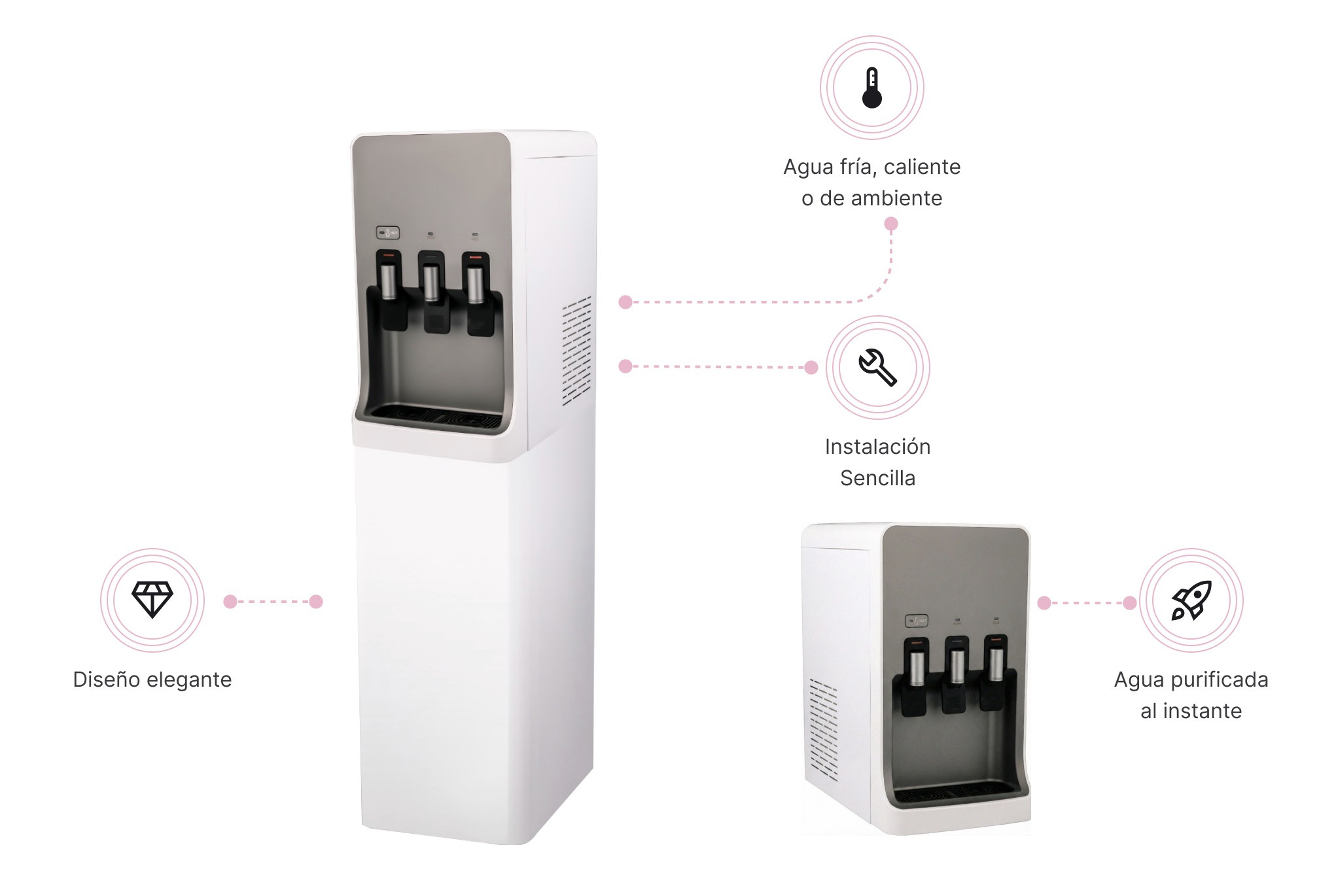 Fuente de agua osmotizada con diseño elegante, disponible en sobremesa o de pie, que se ajusta a tus necesidades para brindar comodidad y estilo en casa u oficina.